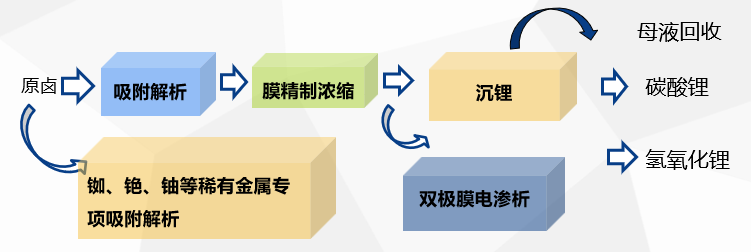 事業部致力于鹽湖資源的綜合開發及利用,基于多種高效吸附材料的開發成果,以及豐富的色譜分離、膜過濾等核心技術的工程設計、實施及運營經驗,已開發出鹵水中鋰、銣、銫、鈾元素的高效連續提取工藝,結合濃縮及轉化工藝,可最終形成電池級碳酸鋰、氯化銣、氯化銫以及重鈾酸胺產品。